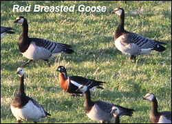 Autumn is a time when birds are on the move and while watching the Geese arrive from the North other birds like Swallows, Whinchat and Wheatear are starting their journeys to the South. This year the Geese have brought a very special bird with them from Russia in the form of a Red Breasted Goose. Although more than four hundred yards away at the time I managed to take a still photo which shows it to be smaller than the Barnacle Geese which it associates with.
