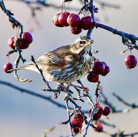 In a neighbours garden the crab-apples were being eaten by Blackbirds, Redwings, Song Thrushes and one solitary Fieldfare. From the bedroom window I had a perfect hide from which to film the berry feast.By the following day it was all over!